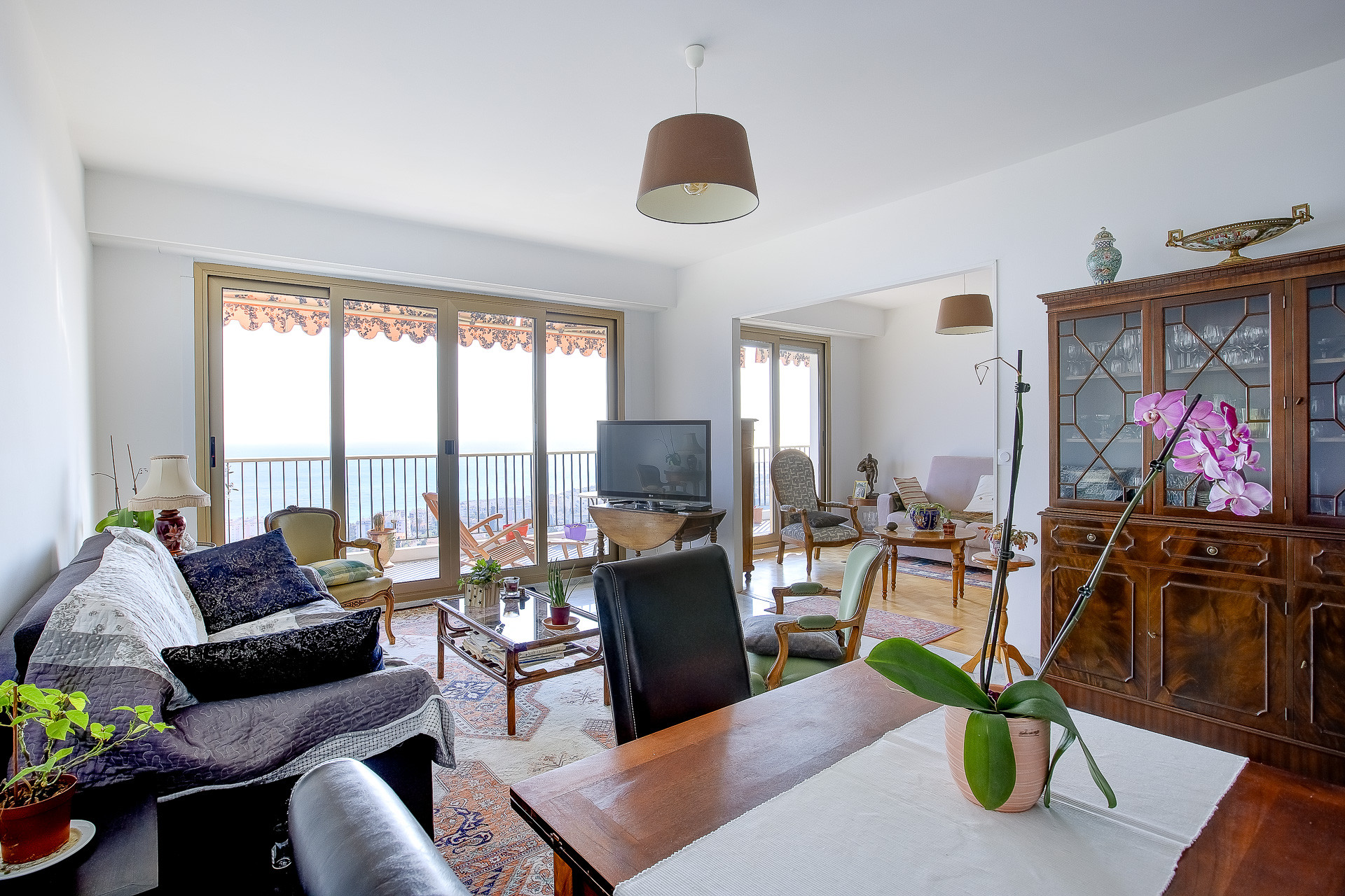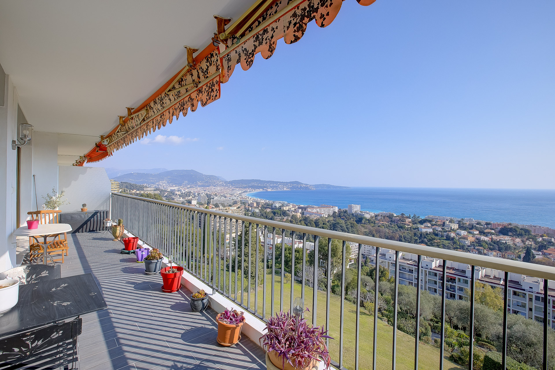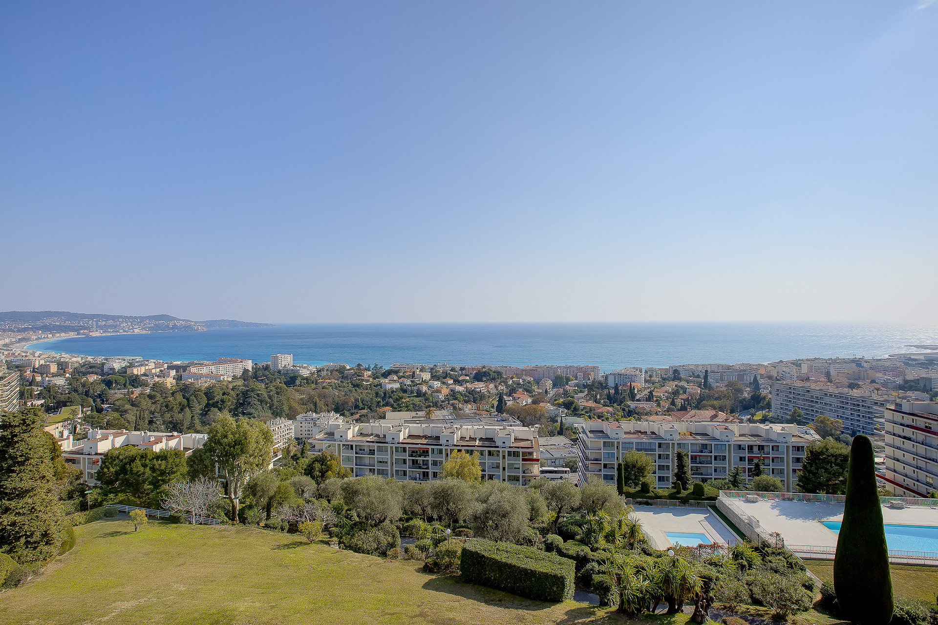 Located in the very sought-after Constellations residence, we offer you this exceptional 115 m² crossing flat, on a high floor, with its large terrace, offering a panoramic view on the sea and the city of Nice. Located near the Promenade des Anglais, the residence benefits from luxury services with its huge swimming pool, its club-house, its 2 tennis courts and a landscaped park. This flat, on a high floor, has a triple exposure, East-South-West, is extremely bright and not overlooked. It has been completely renovated with quality materials. It consists of a large entrance, a double living room of 36 m², a night area with 3 large bedrooms, one of which has a sea view, a magnificent fully equipped kitchen, 3 dressing rooms, 1 bathroom, 1 shower room with toilet and a separate toilet. The large terrace offers an exceptional view of the Baie des Anges, the town of Nice and Saint Jean Cap-Ferrat. A cellar complete this property. Parking