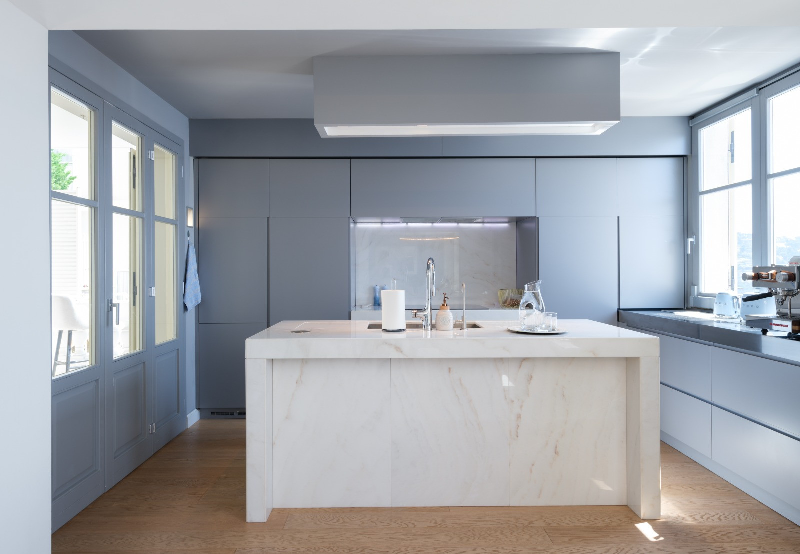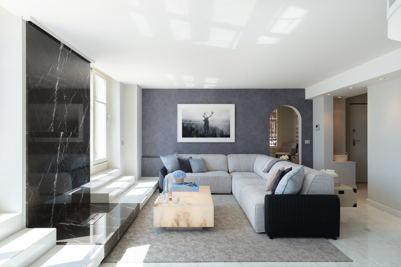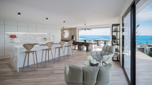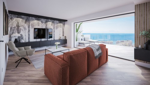 The large living room is an ideal living space for relaxing and entertaining. The large bay windows flood the room with natural light and offer direct access to a spacious terrace Imagine enjoying your mornings sipping your coffee while admiring the stunning views of the Mediterranean Sea