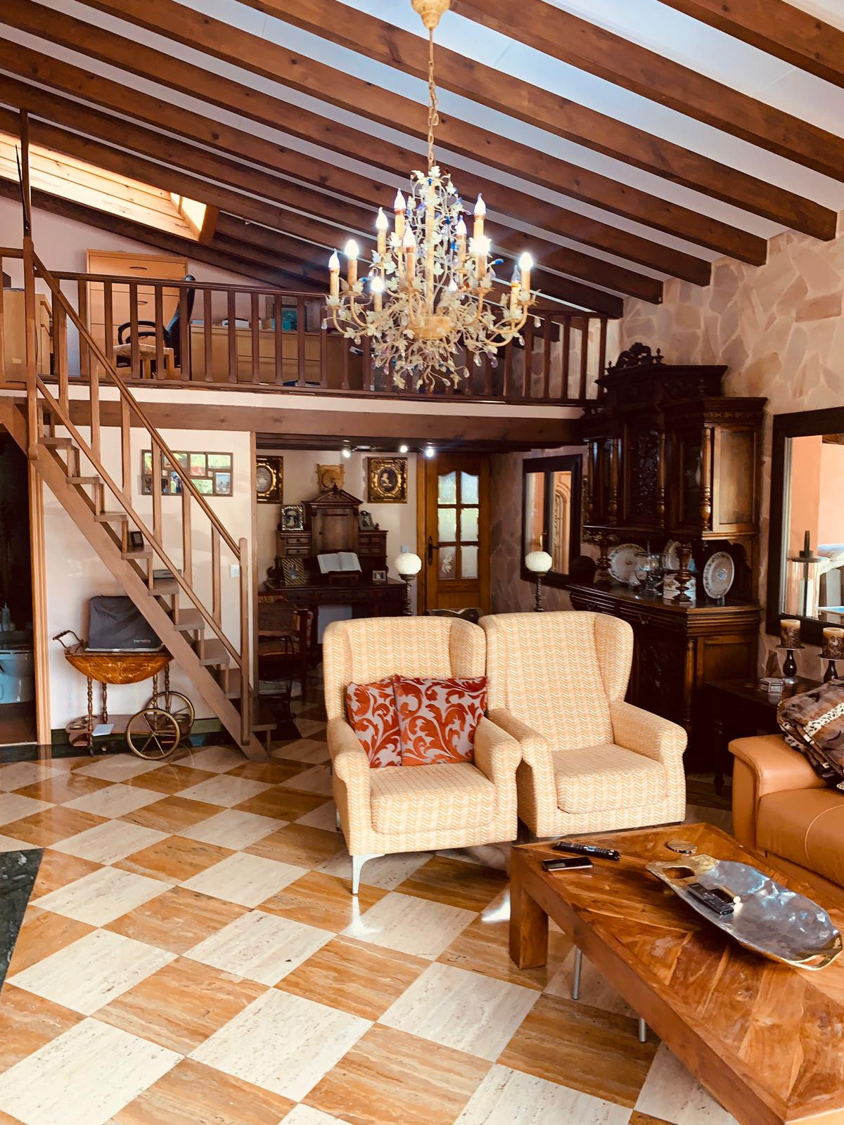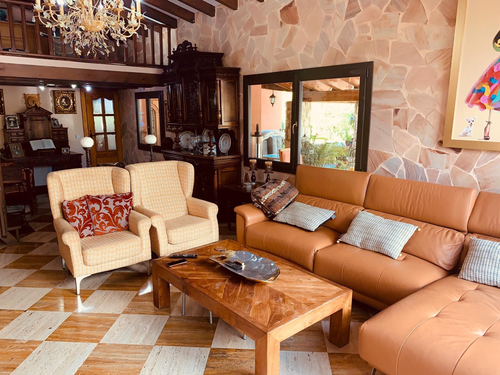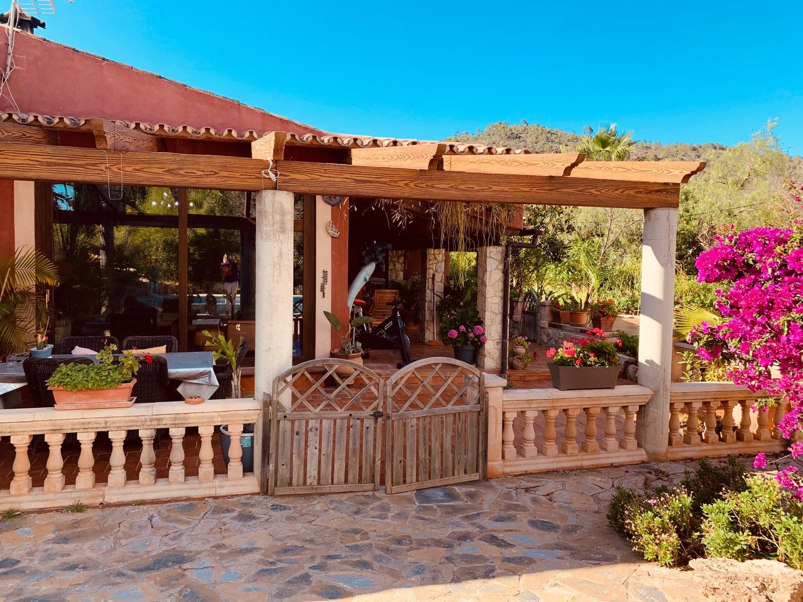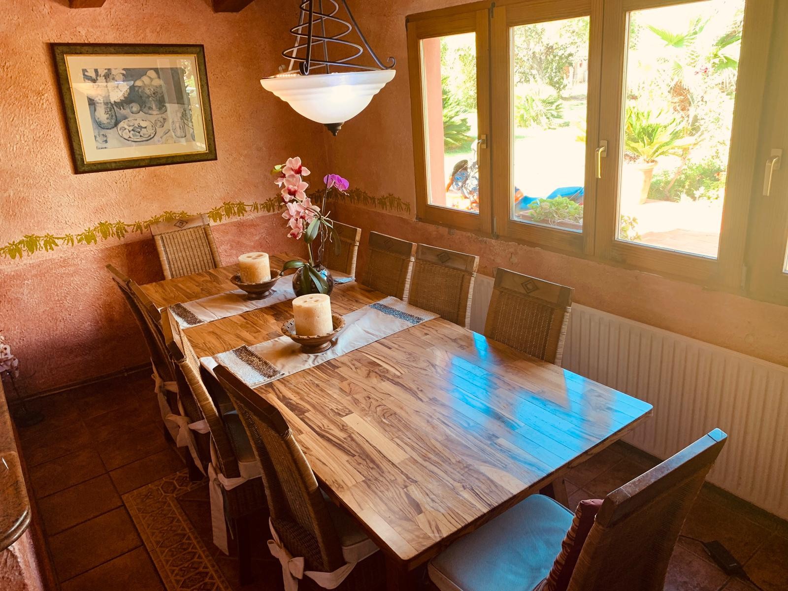 Single storey house of 500m2 consisting of 5 bedrooms, 3 bathrooms (two of which are en-suite), a fitted and equipped independent kitchen, a living room with fireplace, a utility room, a pantry and a cellar. The property enjoys a clear view and possess three covered porches, ideal for enjoying a good meal with your loved ones.