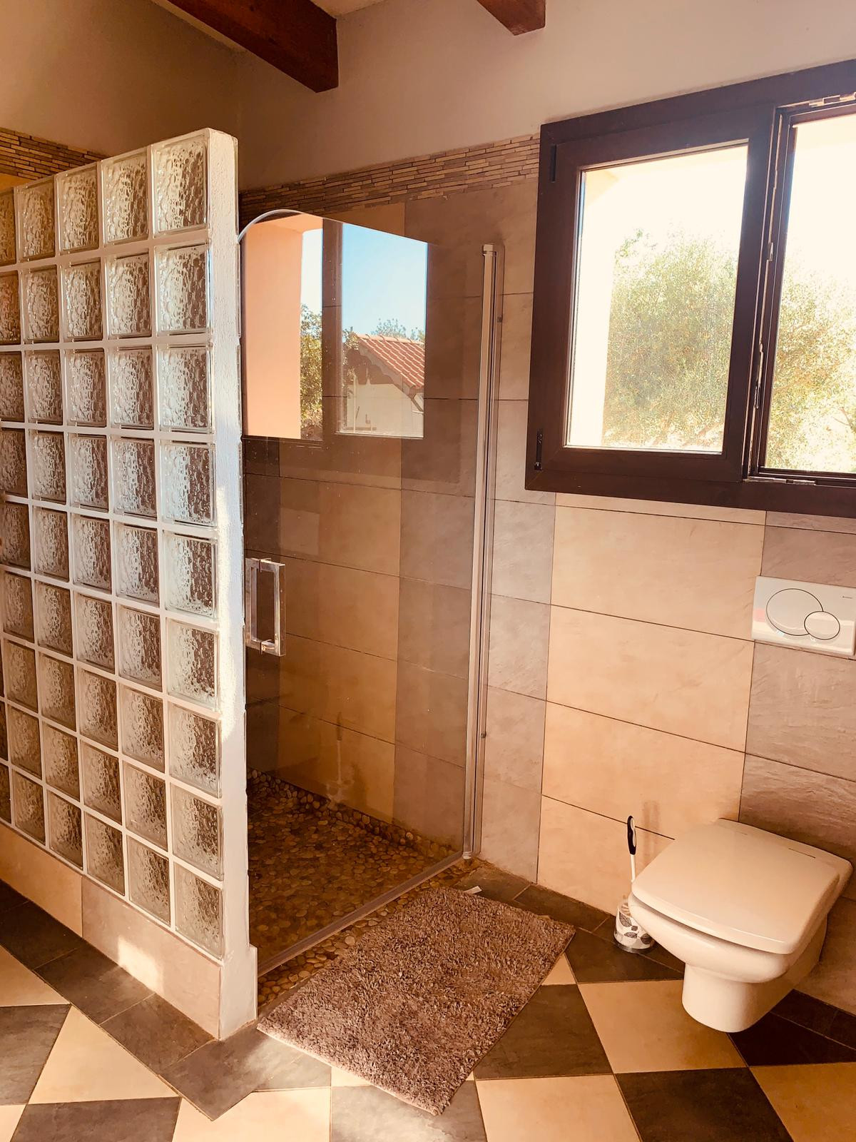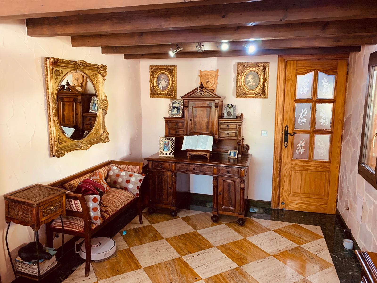 The house has exposed beams. Presence of underfloor heating and marble floors.