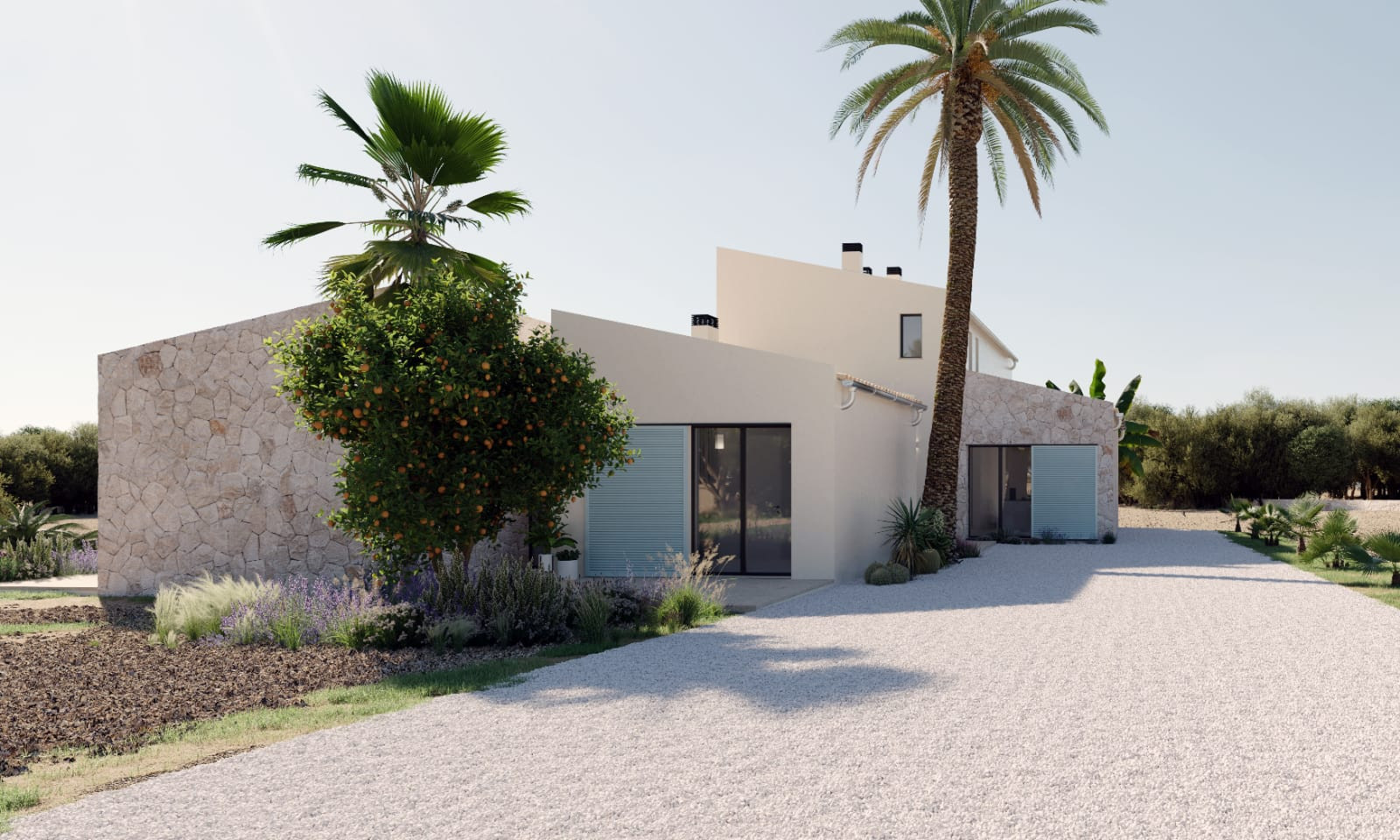 New house, built in 2023, Finca style with a magnificent stone façade. It offers a built area of 371m2, and has a garden of 18,590m2. It has a total of 5 bedrooms with built-in wardrobes (4 of which are en suite), 4 bathrooms, an independent fitted and equipped kitchen, a utility room and a very large living room with fireplace. The master bedroom is on the 1st floor with its 35m2 terrace. The large garden invites you to relax on a deckchair by the pool, and is planted with a wide variety of fruit trees such as carroubiers, orange trees, almond trees, olive trees, etc... You can also keep sheep, horses and chickens to enjoy of the outdoor space. Facing south, the property is bathed in light throughout the day.