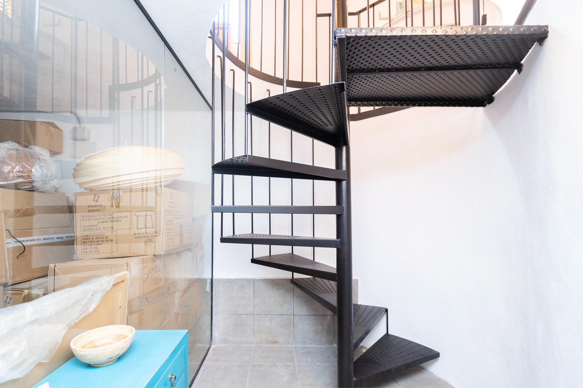 Practical and accessible, with a spiral staircase leading directly to the kitchen.