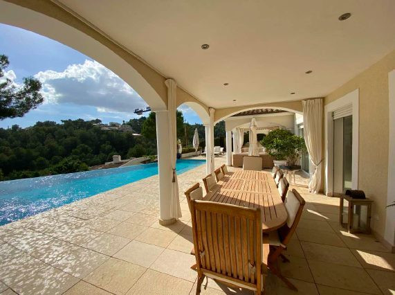 À 10 mn de Palma, 20 mn de l'aéroport et surtout au pied des magnifiques plages d'Illetas, Cala Mayor et Portals. Cette luxueuse villa est située dans une impasse avec une vue à couper le souffle. DESCRIPTION