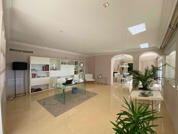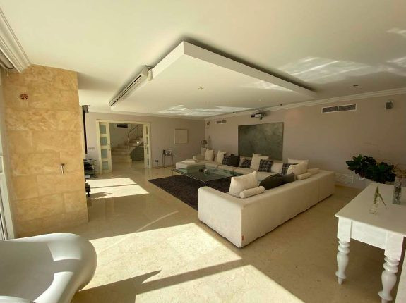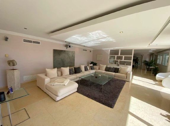 Impressionnante propriété de 1810 m2 construite en 1984 sur un terrain de 769 m2 et rénovée en 2013. Elle se compose au rez-de-chaussée d'un magnifique hall d'entrée tout en marbre beige imposant dès l'entrée une atmosphère lumineuse et luxueuse à la propriété, puis 3 pièces spacieuses en enfilade, double salon et salle à manger et une cuisine meublée et équipée avec accès à la terrasse tout comme les salons.