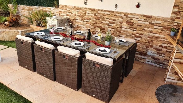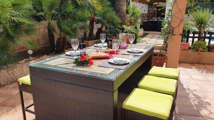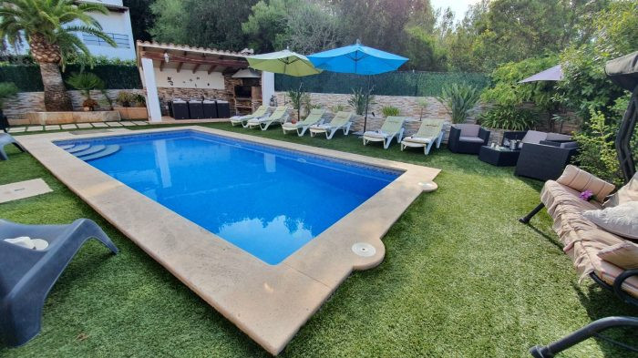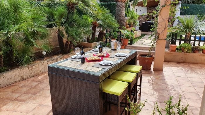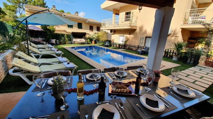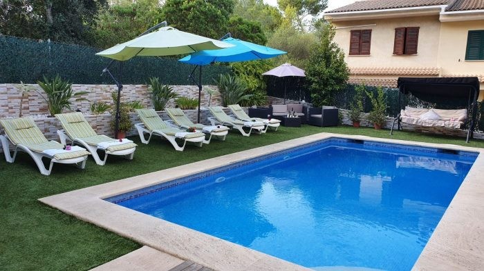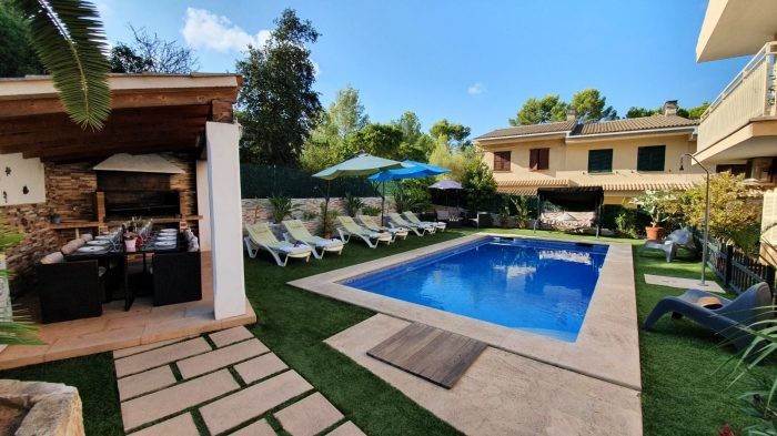 Casa amueblada de 235m2 de superficie habitable en dos niveles. La propiedad está actualmente dividida en dos partes, con acceso desde el interior, lo que es ideal para el alquiler turístico para que cada uno pueda disfrutar de su propio espacio. La planta baja consta de 2 dormitorios con baño, un salón y una cocina. La primera planta cuenta con 3 dormitorios, dos baños, un lavadero y un salón con acceso a la terraza. La casa está muy bien cuidada y tiene una preciosa zona exterior de 490m2 con piscina y una cocina de verano ideal para disfrutar de una barbacoa con sus amigos.